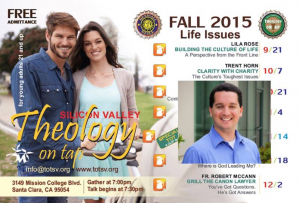 Theology on Tap - Silicon Valley TRENT HORN CLARITY WITH CHARITY The Culture’s Toughest Issues Gather at 7:00pm Talk begins at 7:30pm Arrive before 7:10pm and YOUR FIRST DRINK IS ON US! 3149 Mission College Blvd. Santa Clara, CA 95054 Click Here for more details about 2015 Theology on Tap FALL 2015 - Life Issues