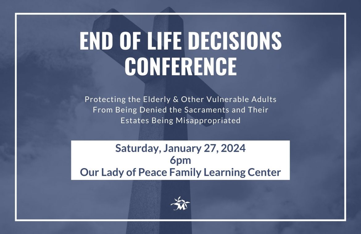 End of Life Decisions Conference Protecting the Elderly and Other Vulnerable Adults from Being Denied the Sacraments and Their Estates Being Misappropriated Saturday, January 27, 2024 at 6pm in the Family Learning Center This free conference will explore euthanasia, end-of-life medical situations, estate planning, Health Care Directives, and various other topics to help you & […]