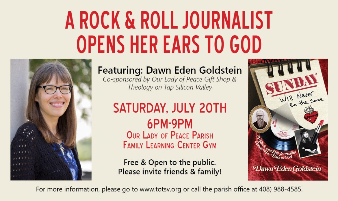 On Saturday, July 20th, come join us for an evening with Dawn Eden Goldstein as she recounts her spiritual journey from rock & roll journalist to theologian. Her books will be available for purchase at the event. 6:00pm Doors Open, Reception 7:00pm Talk by Dawn Eden Goldstein 8:15pm Book Signing From when she was a […]